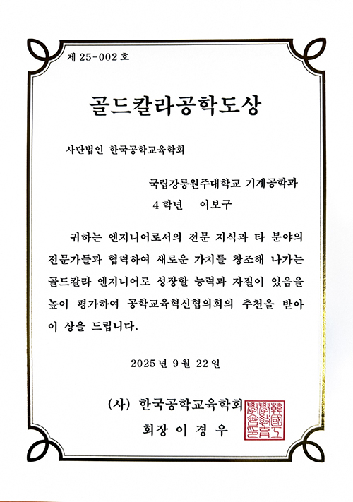 기계공학과 여보구(2020학번) 학생이 지난 9월 22일 대구에서 열린 2025년 공학교육학술대회에서 '골드칼라 공학도 상'을 수상했다.